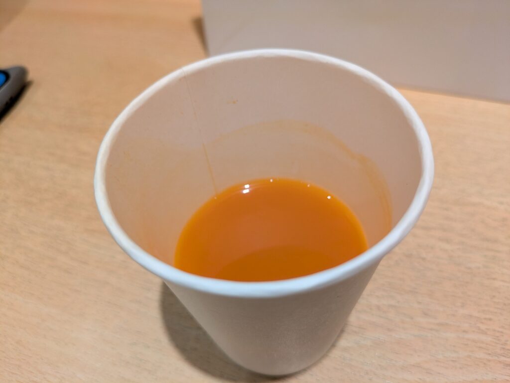 半分ほど野菜ジュースを飲んだところで思い出したかのようにパシャリ。