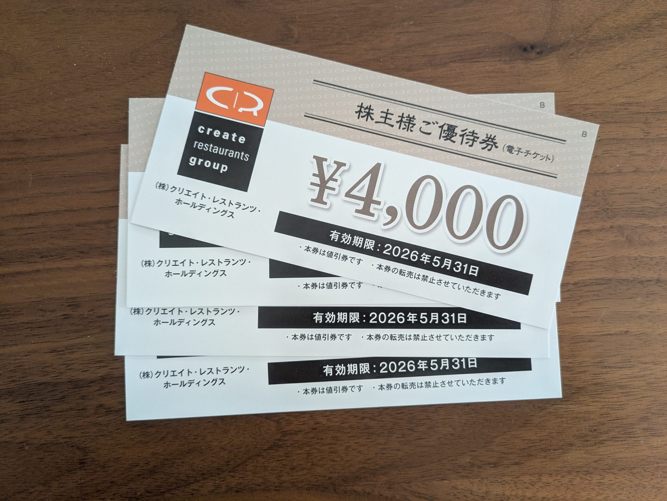 クリエイト・レストランツ・ホールディングスのお店で使える優待券が4000円×4枚で16000円分きました。