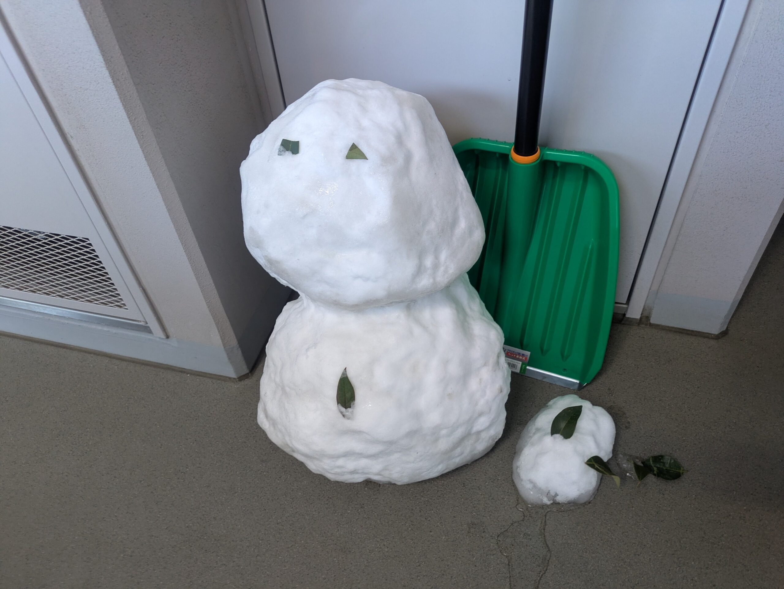 写真は先日雪が降った時に、妻と子供達が雪かきがてらに作った雪だるまです。
